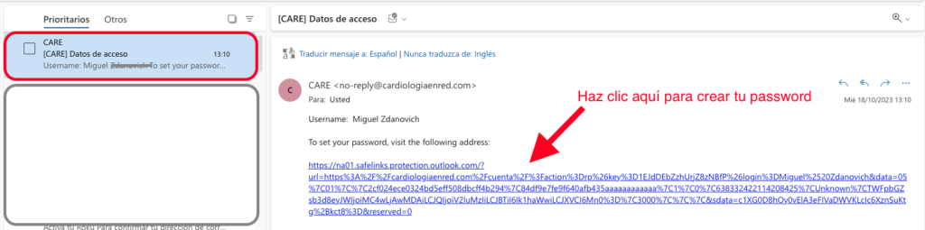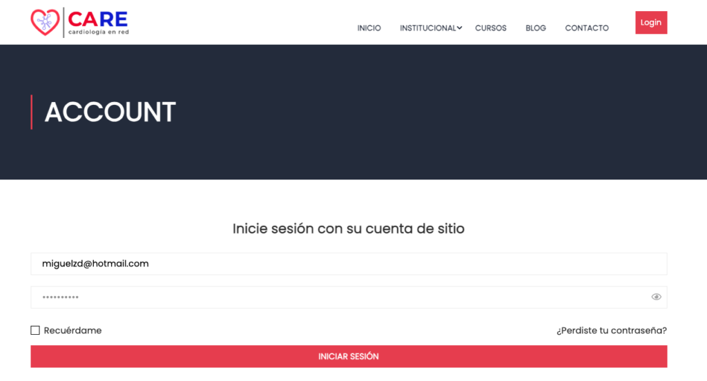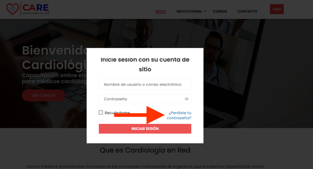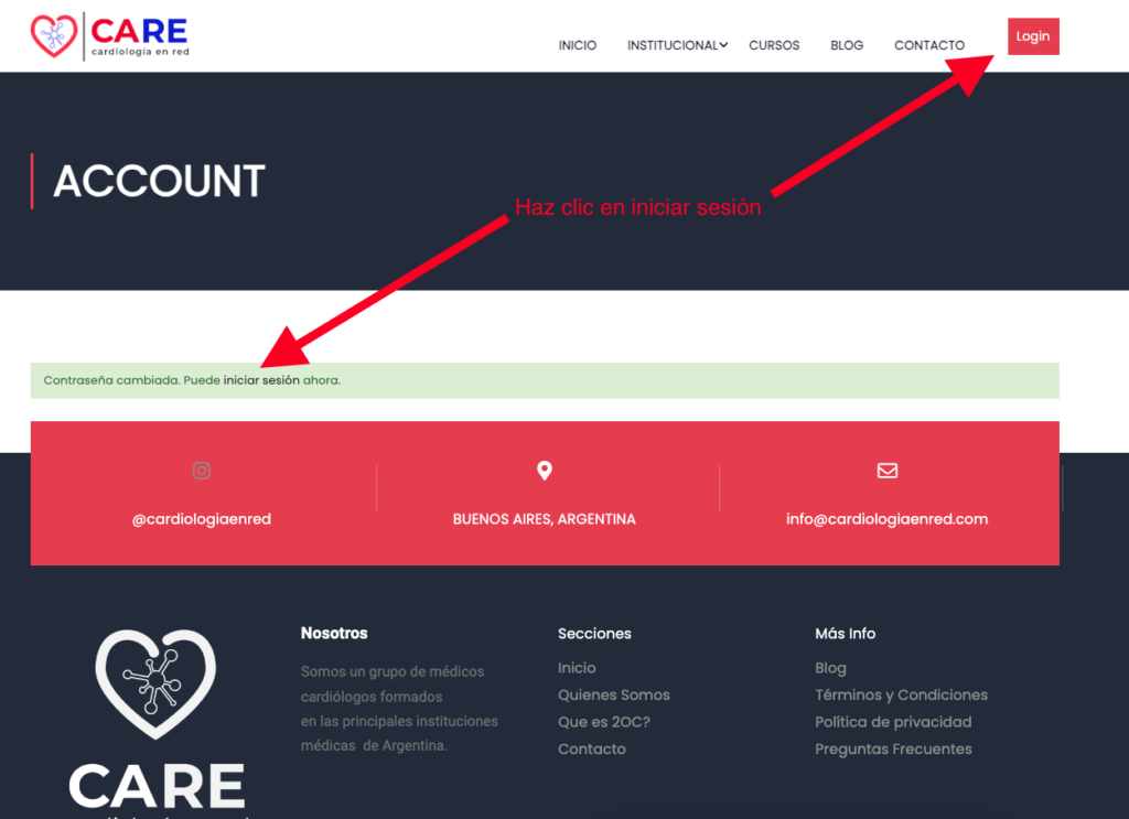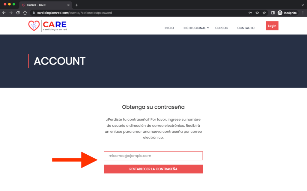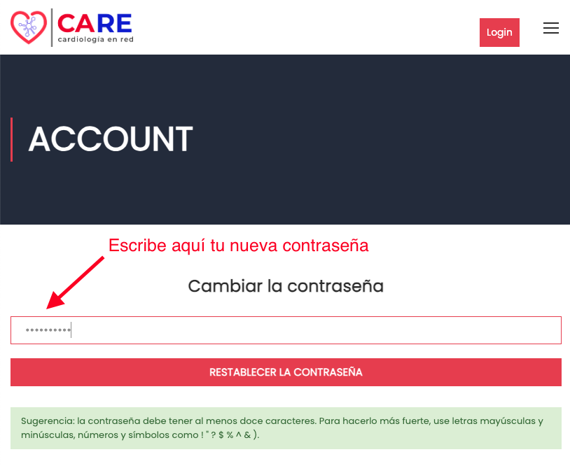 Al hacer clic en el enlace que te llego por email en el paso anterior, para que te redireccionamos al sitio web de Cardiología en Red (CARE) para que puedas definir tu nueva password.