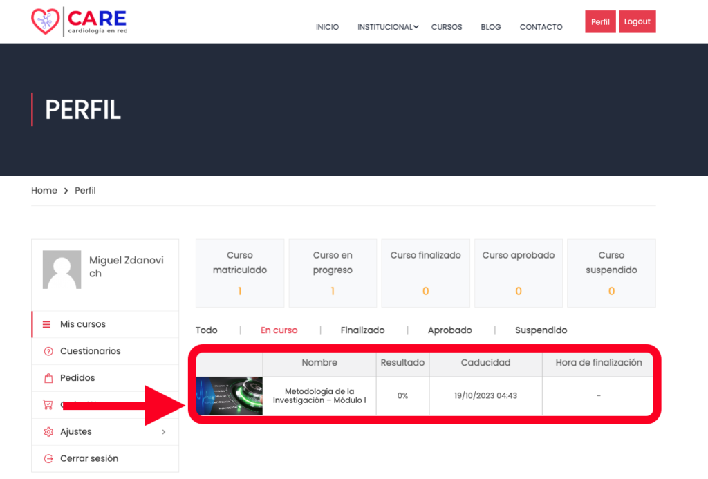 En tu perfil de alumno vas a encontrar tus cursos asignados, también podrás ver el progreso de las clases tomas.