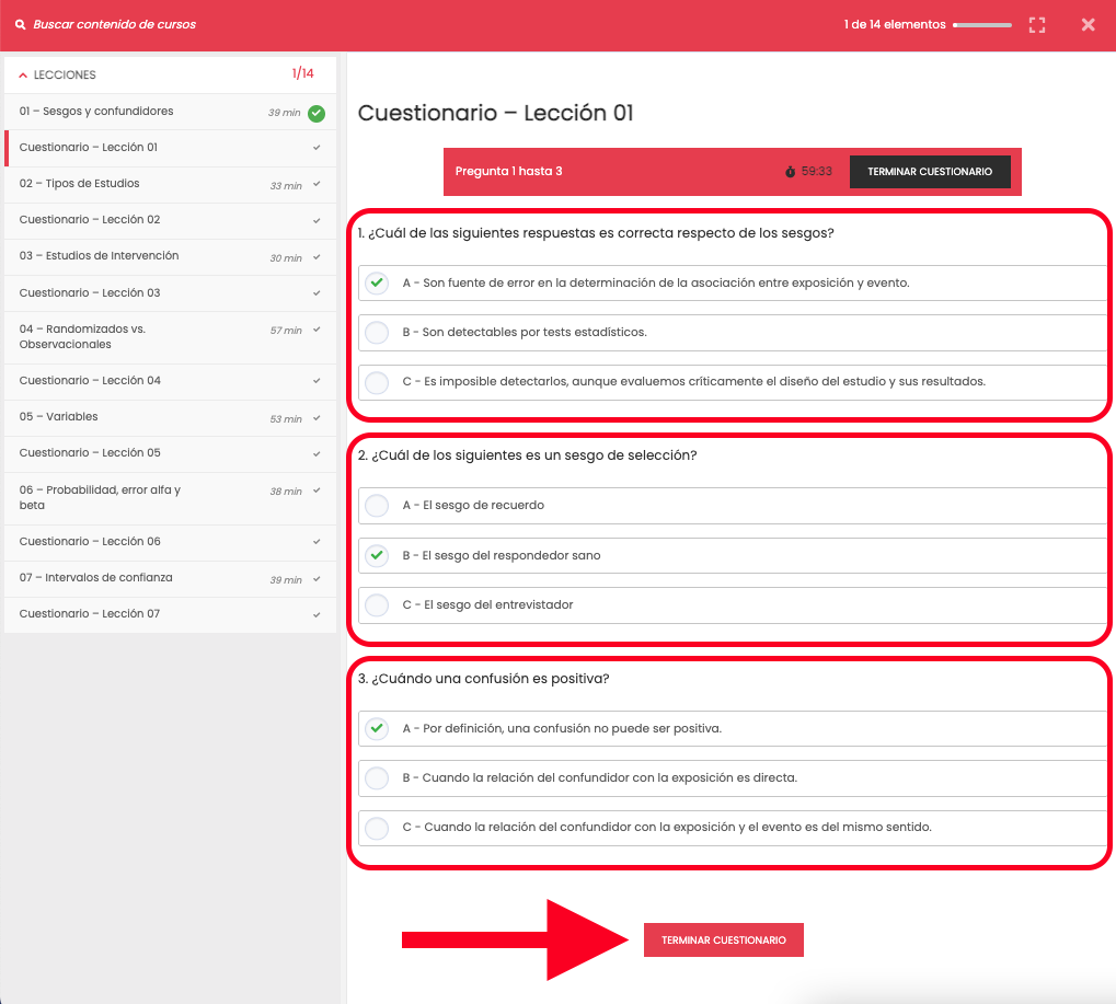 Por cada lección tomada tendrás una pequeña evaluación de tipo múltiple choice para medir lo aprendido.