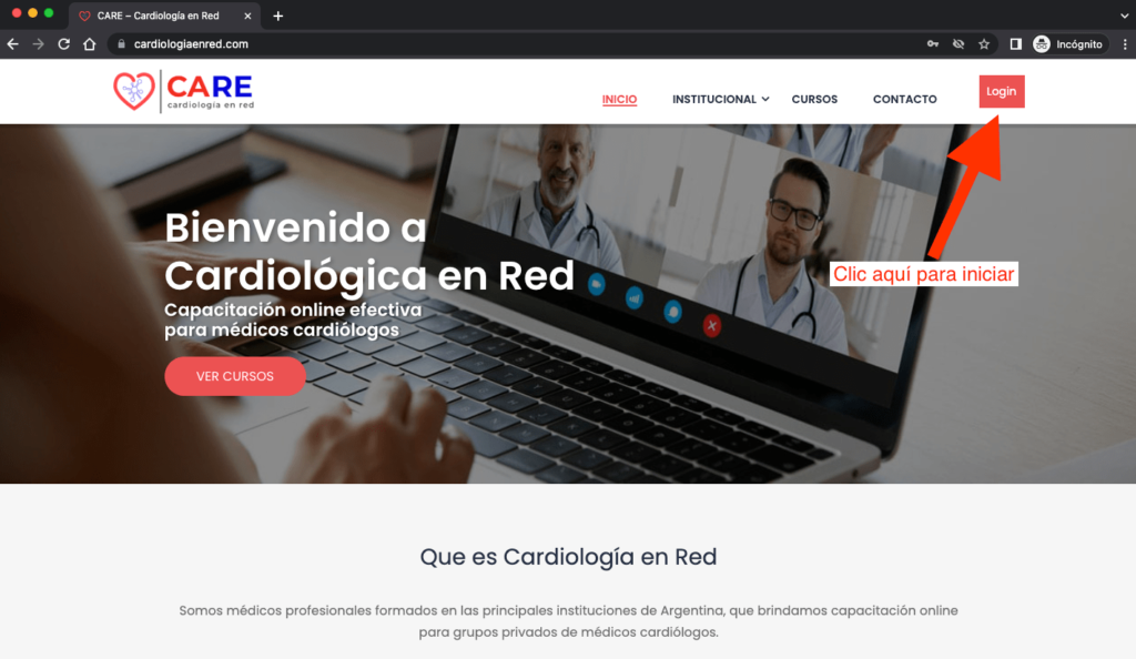 - PASO 1 – Para EMPEZAR ingresa al sitio web de CARDIOLOGÍA EN RED https://cardiologiaenred.com/ y haz clic en el botón de LOGIN